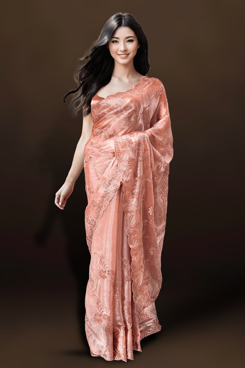 pastel peach saree - peach colour saree - peach saree - peach pink saree - peach saree look